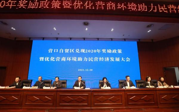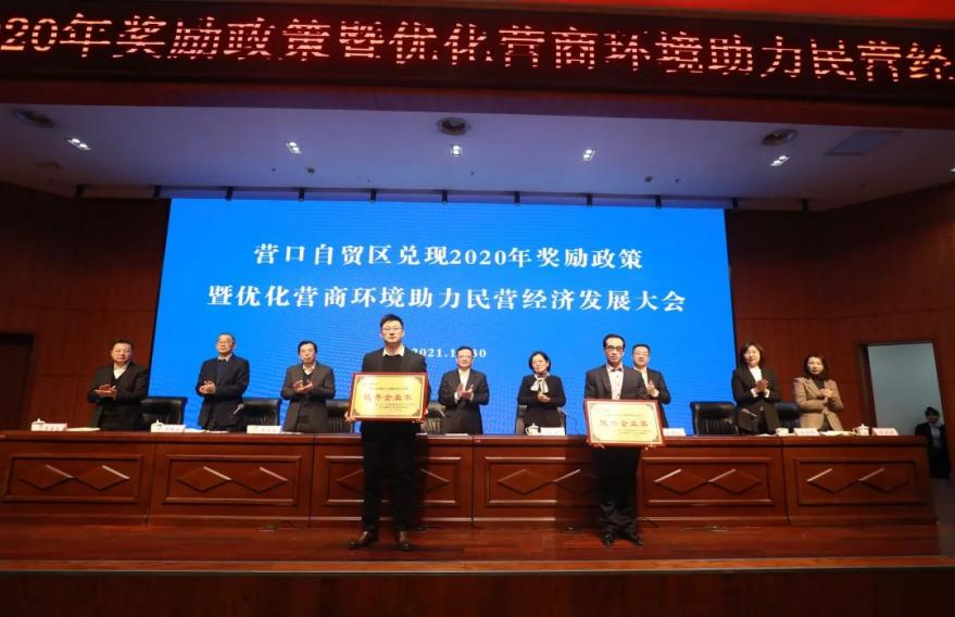 2021年12月30日,我公司參加了由營口自貿(mào)區(qū)黨工委、管委會召開的“兌現(xiàn)2020年獎勵政策暨優(yōu)化營商環(huán)境助力民營經(jīng)濟發(fā)展大會”,參會的人員有自貿(mào)區(qū)黨工委、管委會領(lǐng)導(dǎo)班子成員、管委會各部門負(fù)責(zé)人、國企公司、各派駐機構(gòu)代表以及獲獎企業(yè)代表,共計100余人。